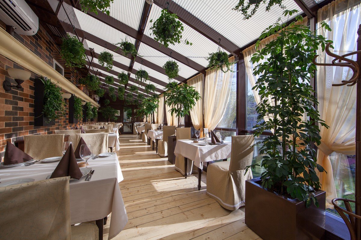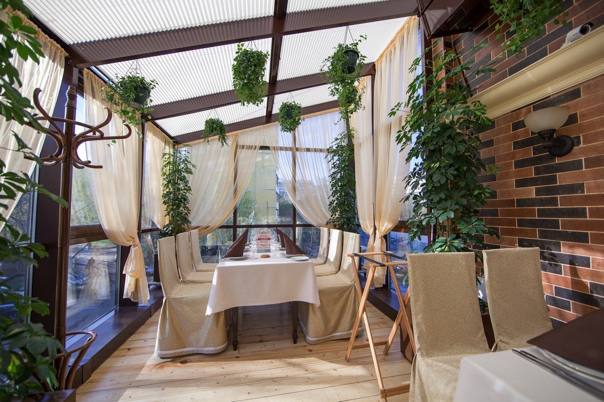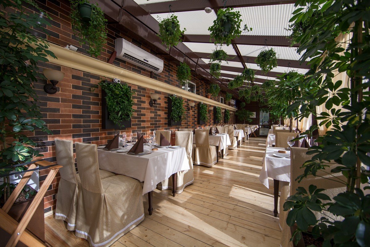 Наш ресторан расположен на крыше! Он славится не только вкусными блюдами и напитками - мы привлекаем интерьером внутри и вокруг. Если вы - ценитель красоты и эстетики, приходите в наш ресторан.